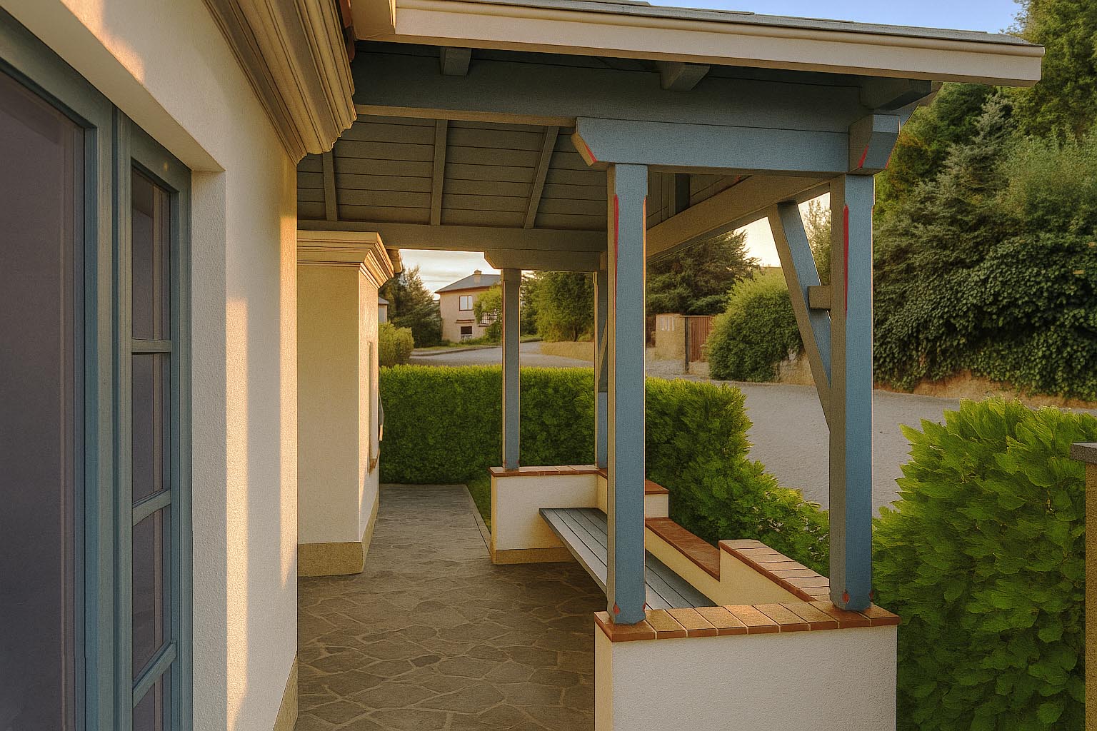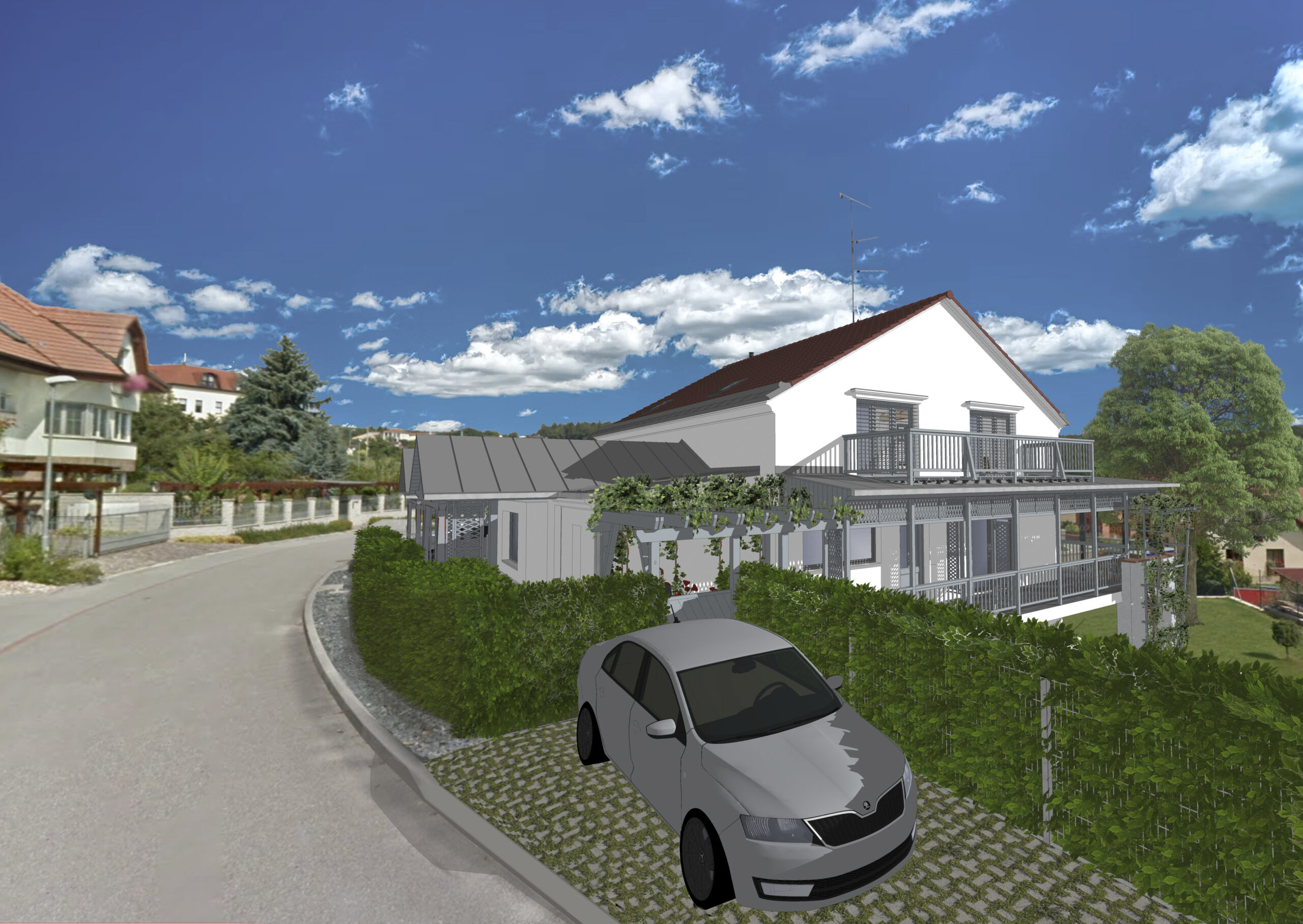 Druhým krokem bylo vytvoření nového vstupu pro byt v 1.NP. K tomu jsme využili prodloužení stávající terasy a orientaci k novému vstupu s novým parkovacím místem.