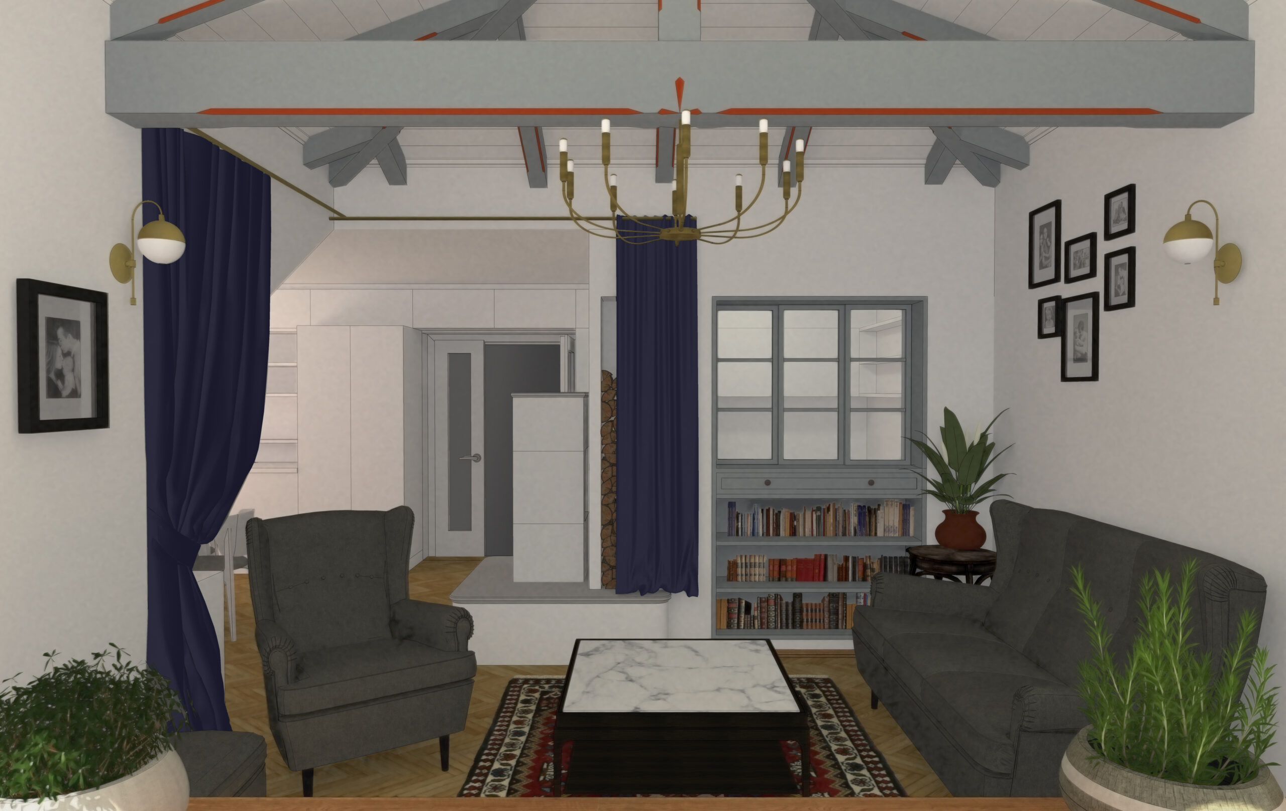 Životaschopný záměrem se stala cesta vytvoření bytové jednotky v podkroví 2.NP a tento byt provozně oddělit od bytu rodičů v 1.NP. Za tímto účelem jsme navrhli využít stávajícího hlavního vstupu pro horní byt, doplněný o nové zádveří s pracovnou.