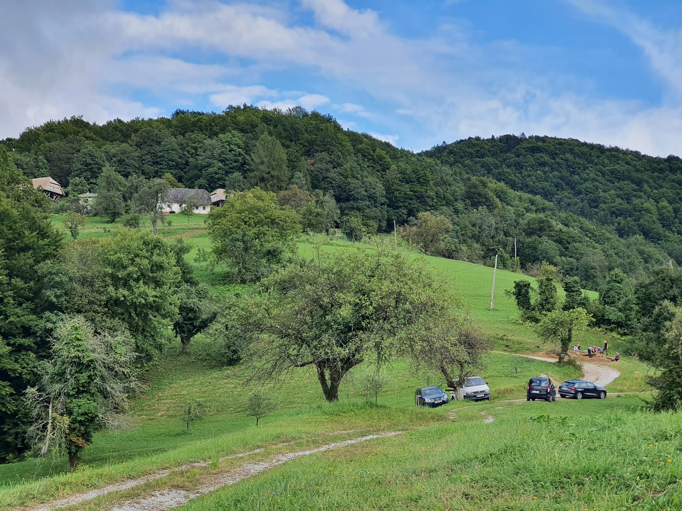 Svahem, na jehož úpatí se nachází vjezd na pozemek, se klikatí příjezdová cesta k budovám na vrcholu. Jan měl představu, že jeho zákazníci a návštěvy budou parkovat dole a nebudou mu rozhrabávat jeho štěrkovku koly svých aut. Cesta pro pěší ale není nikterak definovaná a jít po cestě je zdlouhavé. Navrhněte mi pěšinu, která by byla natolik přirozená, jako by tam odjakživa patřila.