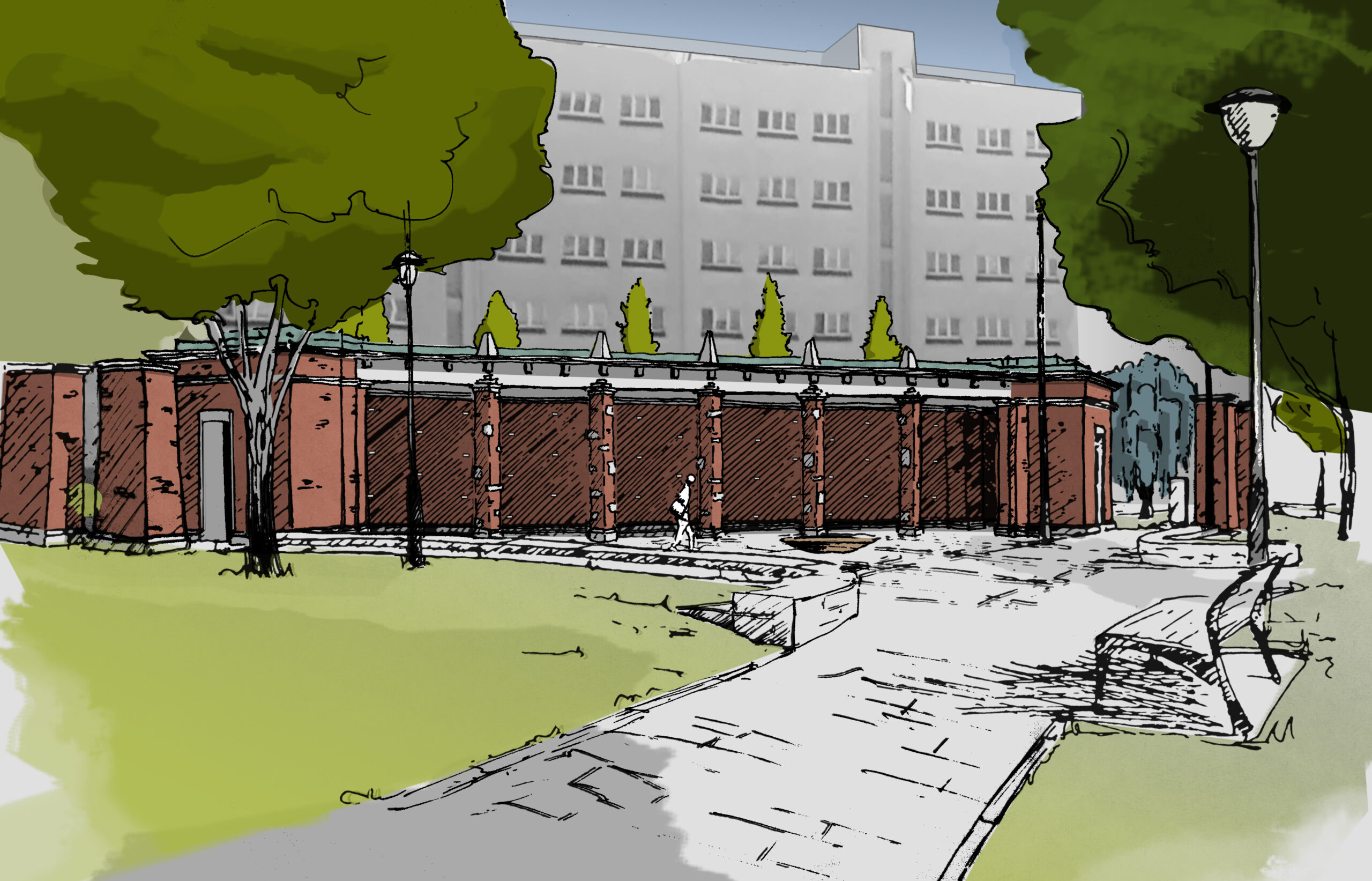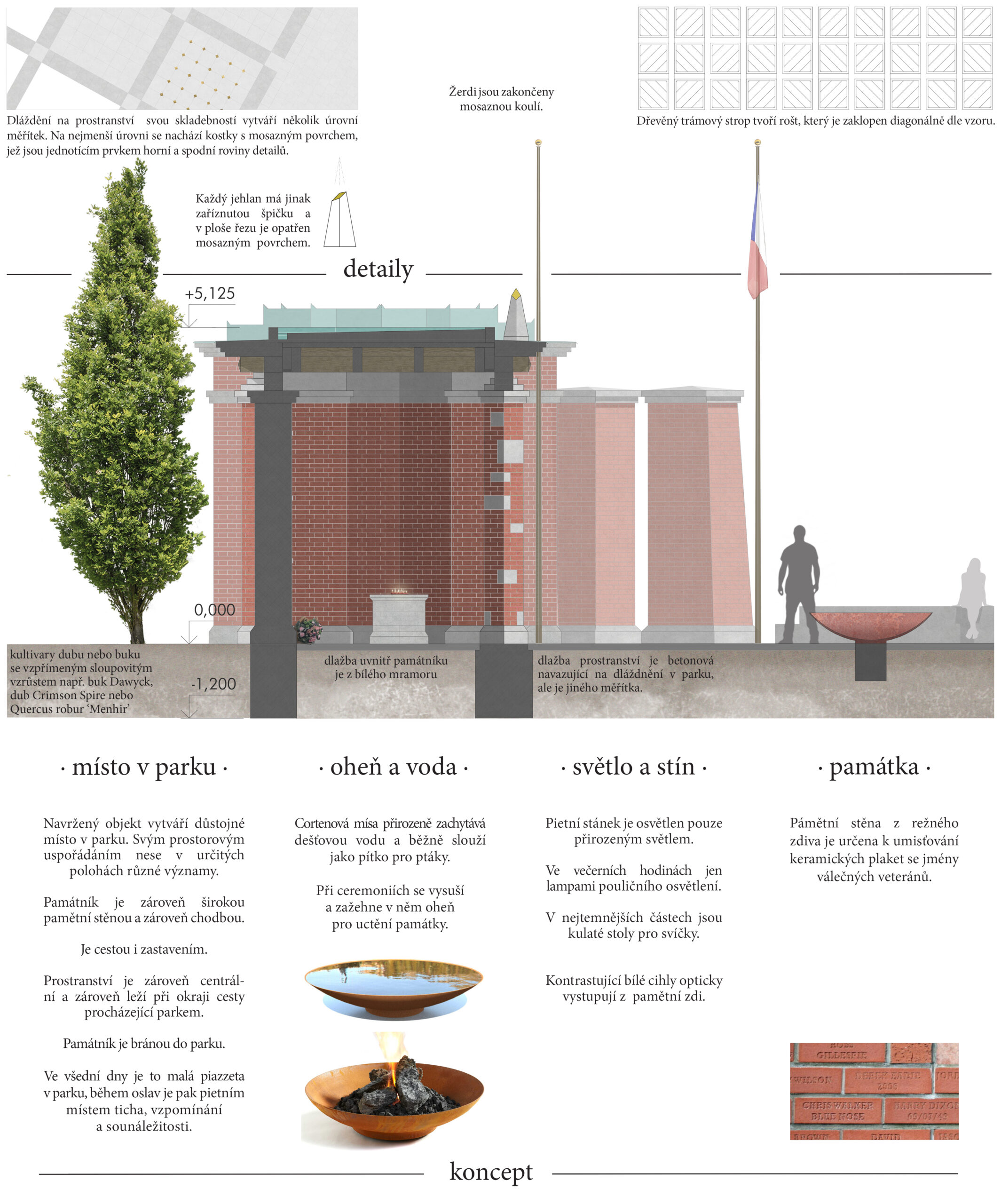 Mým záměrem bylo navrhnout stavbu, která by s parkem dotvářela důstojné místo pro formální ceremonie uctění piety a zároveň posílila intimitu parčíku a možnosti využití během všedních dní.