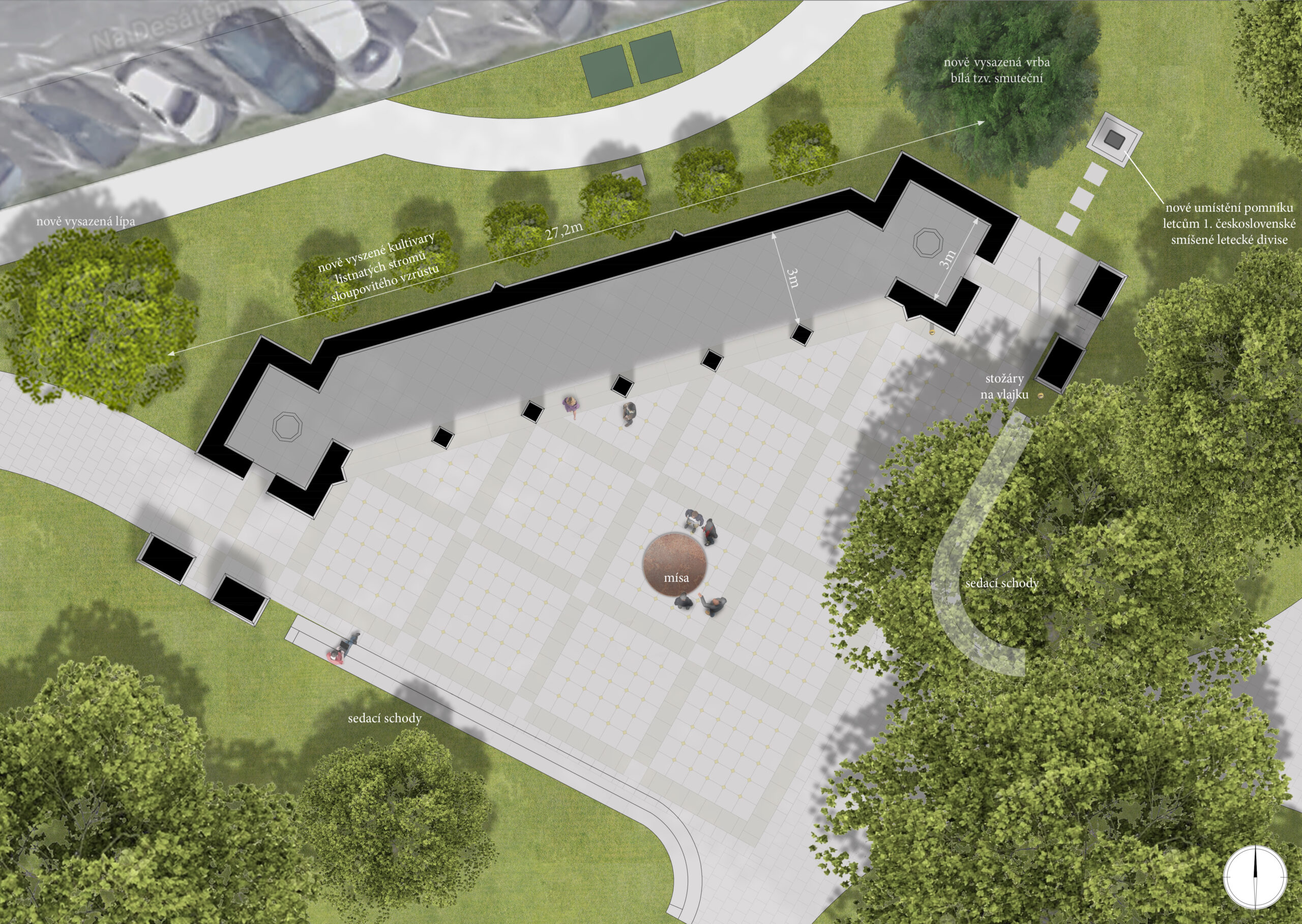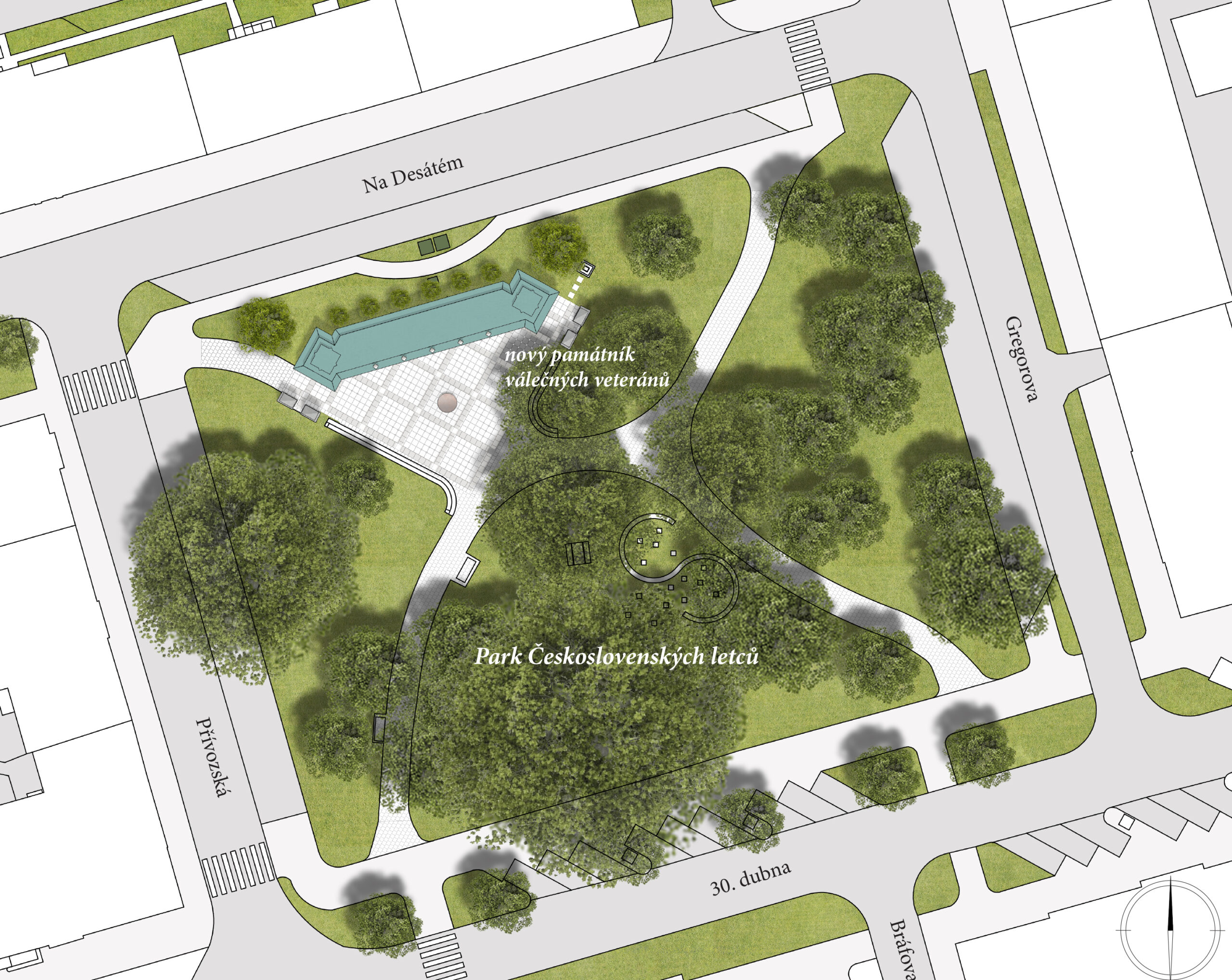Vzhledem k tomu, že místo bylo přísně vymezeno podmínkami soutěže, využil jsem prostranství bez vzrostlých stromů ke konkretizaci přirozeného těžiště parku při samém okraji, kde se sbíhají cestičky probíhající diagonálně.